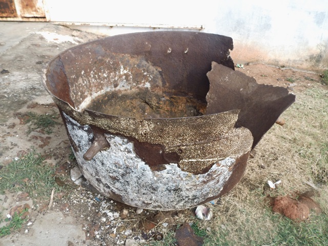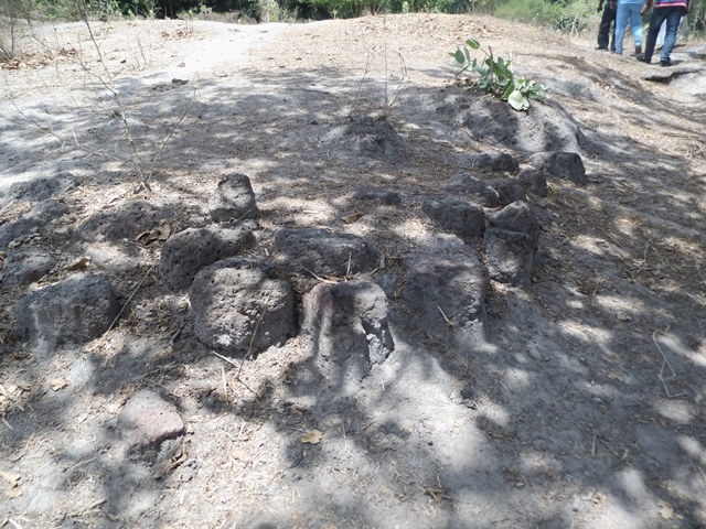Il me conduit sur l’emplacement du palais. Il décrit certains endroits : le mur de 7 mètres de haut et de 7 mètres de large (aujourd’hui longue monticule de terre sur laquelle ont poussé des arbres ! je pense au mur d’Agokoli) sur un rayon de 9km, la guérite de la sentinelle (plus sorcier que guerrier), le fétiche qu’il se refuse formellement de nommer ; la pierre des guerriers avec ses trois creux où on mettait du lait de vache, du sang d’une victime et du vin, (les autres trois creux seraient les empreintes laissées par le fétiche qui venait s’accroupir pour boire : aisé de se représenter les membres dudit fétiche), la monticule de fiente de chevaux, les ossements des derniers morts de la bataille du Kansala
